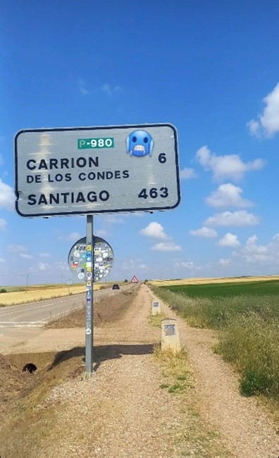La verità è che le Mesetas spaccavano i gruppi: le tappe erano lunghe, dritte, piatte, interminabili; qui si metteva veramente alla prova la resilienza dei pellegrini ed il loro allenamento. Anche gli altri rimasti indietro, ho saputo poi che si erano ulteriormente divisi. Io e Nicholas abbiamo macinato chilometri su chilometri costeggiando quasi sempre la statale, tappe orrende. Strade dritte con alberelli piantati pedissequamente ad una distanza di qualche metro uno dall’altro: troppo bassi per produrre ombra e troppo artificiali per essere belli. Era tutto uguale e sembrava di non avanzare mai come dentro ad un’ipnosi.